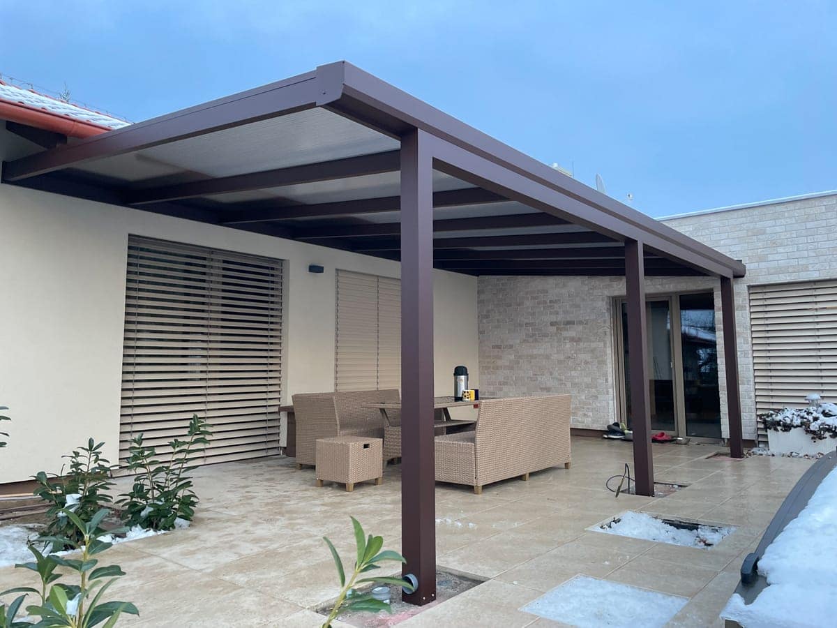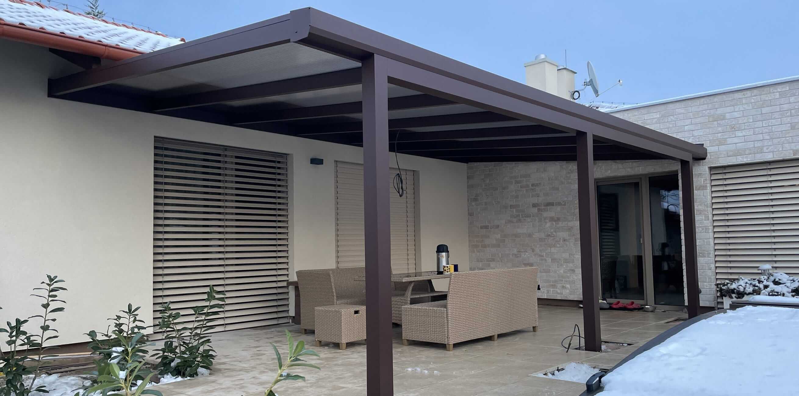Konstrukci pergoly nabízíme v základních barvách – 7016 Antracit, 8017 Hnědá, 9006Sp Stříbrošedá a 9010 Bílá.