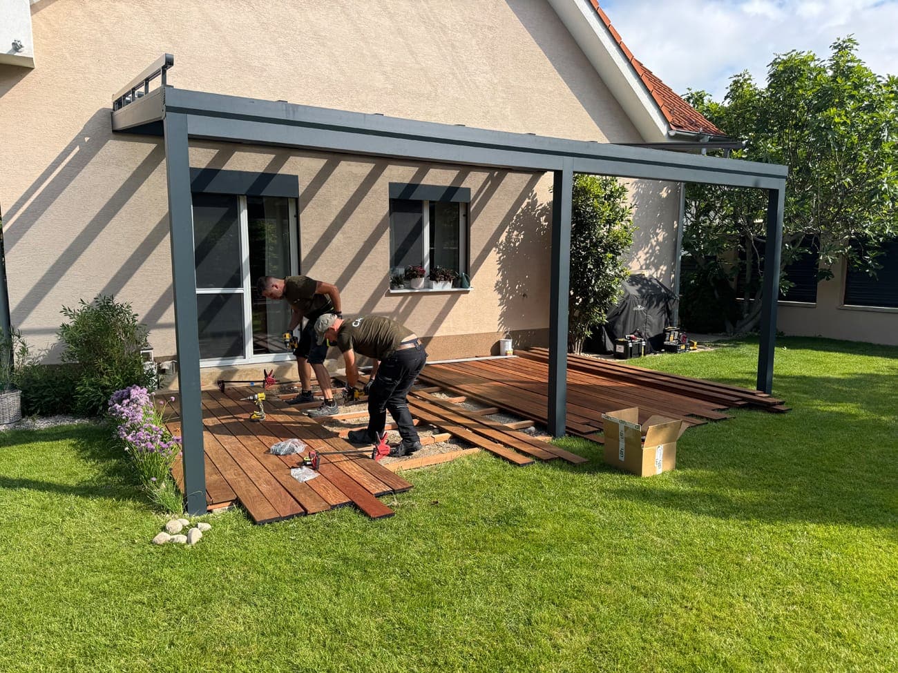 Montáž pergoly trvá nejméně ze všech zahradních staveb. Montáž běžné pergoly nám trvá přibližně 2 až 8 hodin. Standardní dodací lhůta je 3 až 5 týdnů. Při výběru pergoly z barev, které máme skladem, vám ji za příplatek dodáme do 1 týdne.
