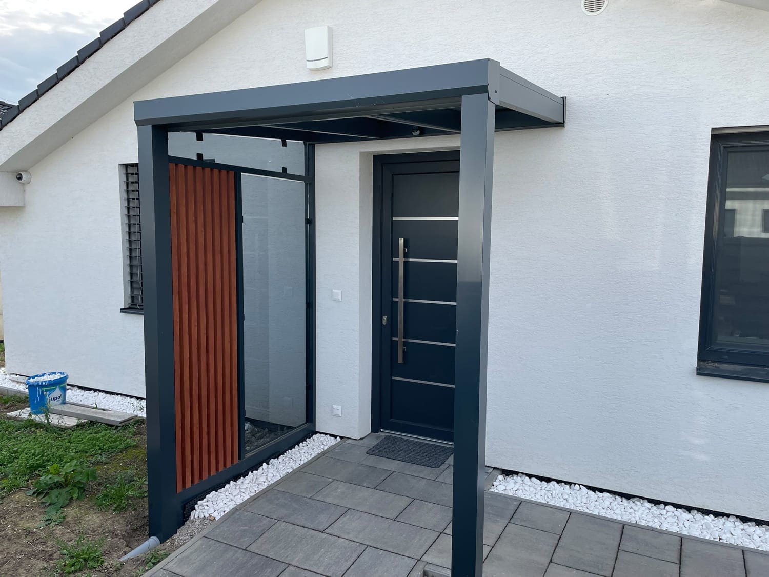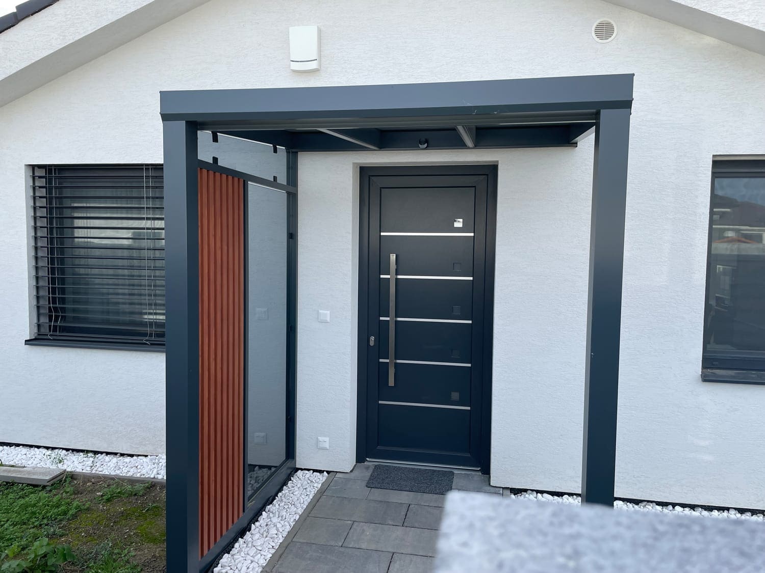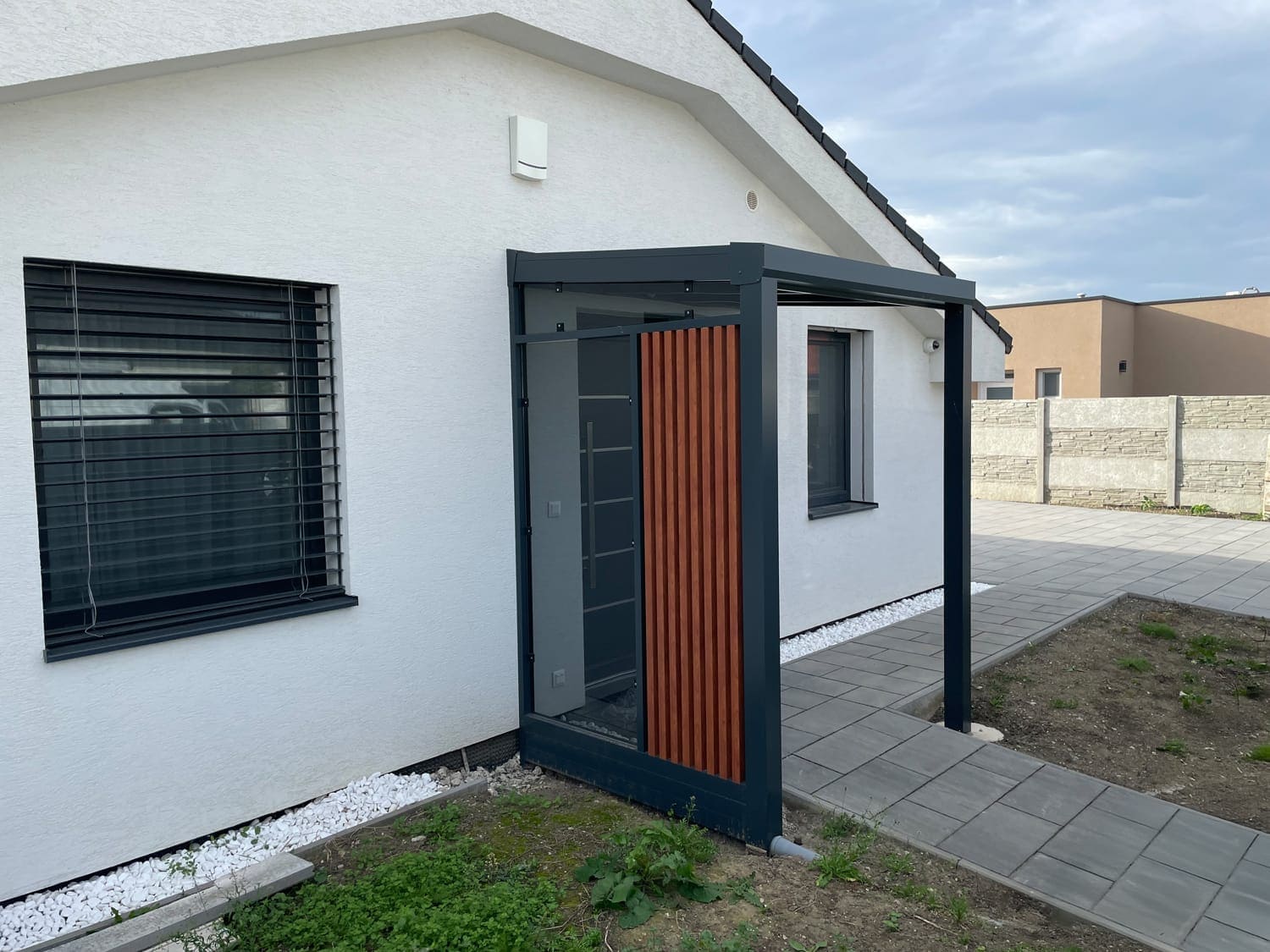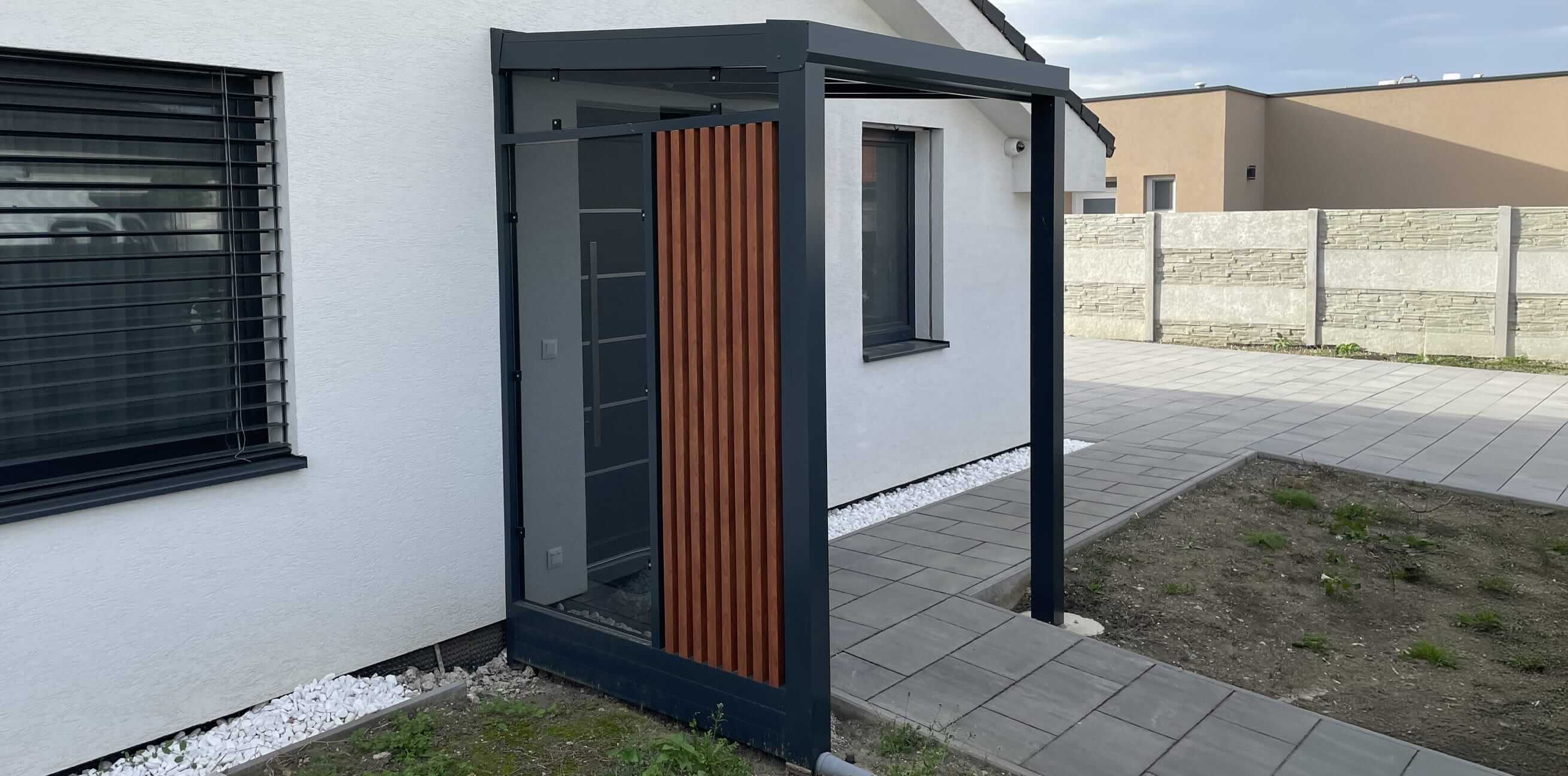 Moderní pergola s ochrannou funkcí u vstupu
